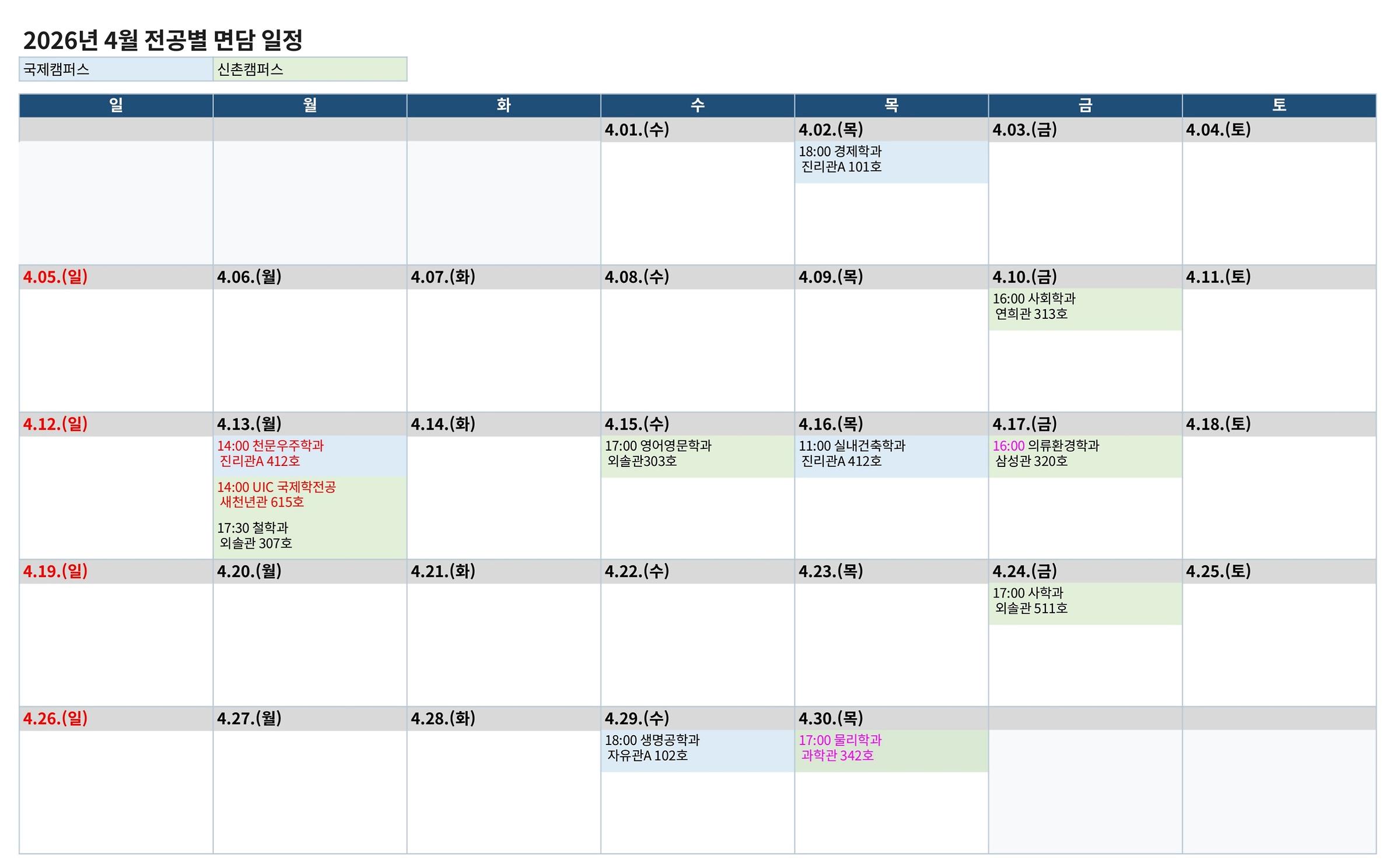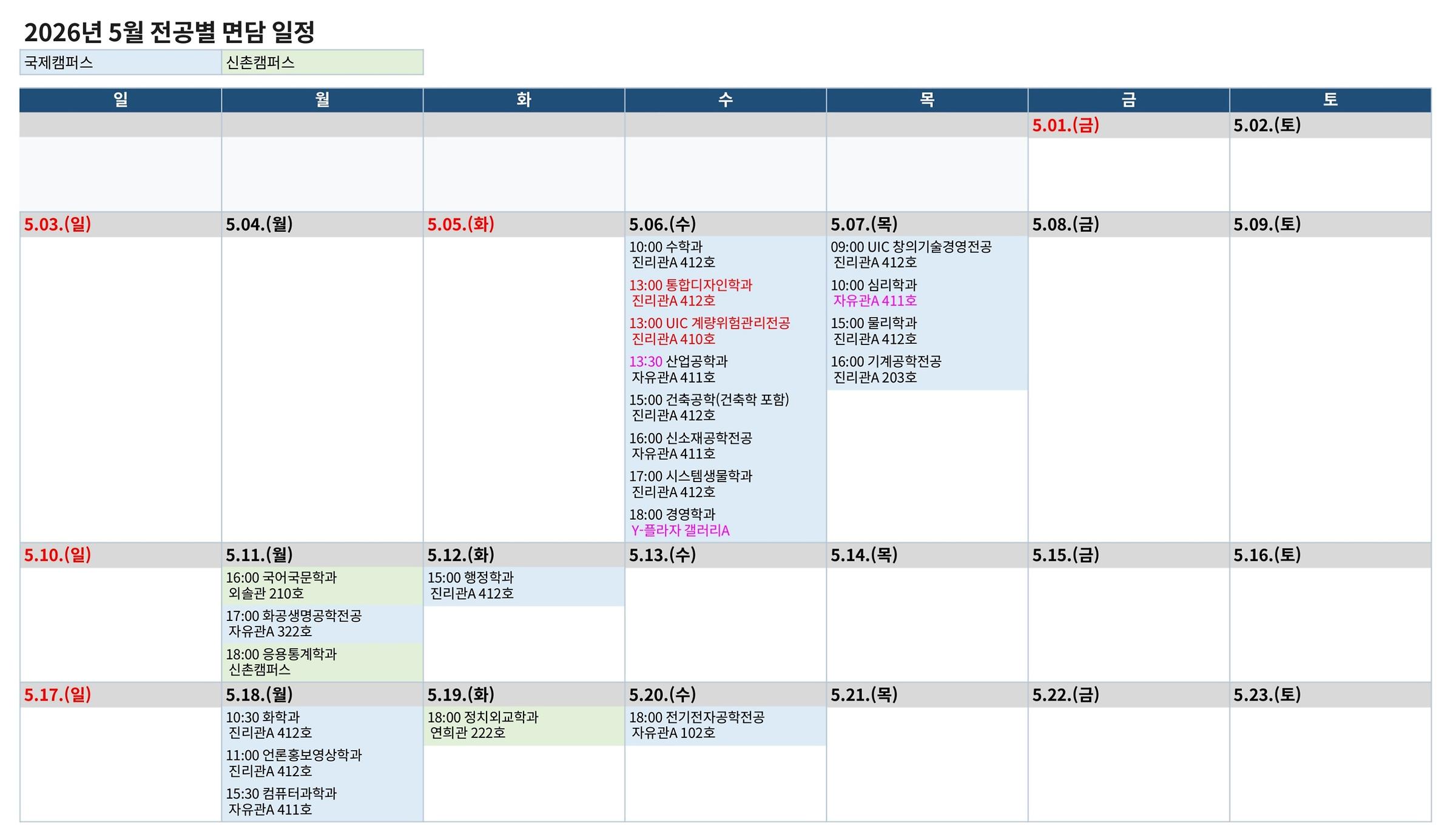 - 전공별 면담 일정 및 장소는 상황에 따라 변경될 수 있습니다.