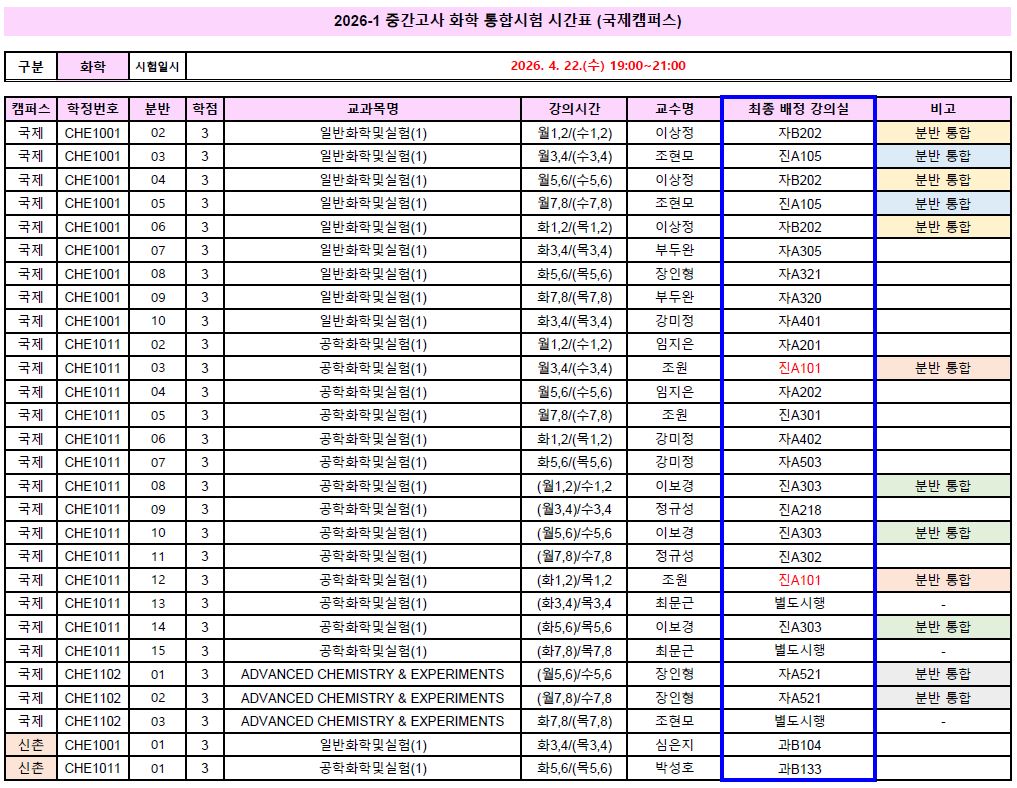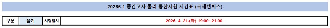 2026-1학기 중간고사 통합시험 시간표를 안내드리오니 일정을 참고하시기 바랍니다.