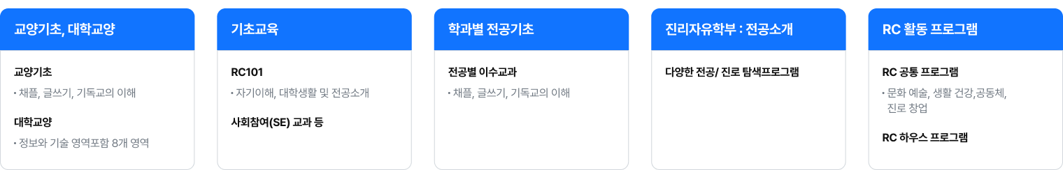 - 기초학업역량 강화를 위한 양질의 교양기초, 대학교양 및 전공탐색을 위한 RC101, 아카데믹 브릿지 페어, 커리어 브릿지 페어와 각종 RC프로그램 등 다양한 교과 및 비교과 프로그램이 제공된다.