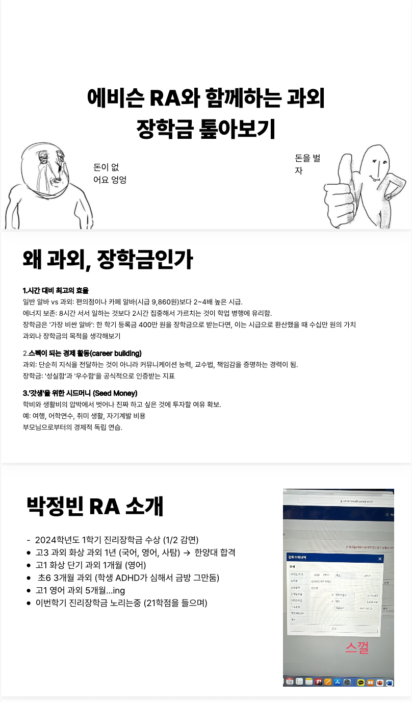 <과외·장학금 톺아보기>는 단순한 정보 전달의 차원을 넘어, 학생들이 실제로 활용할 수 있는 지식을 공유했다는 점에서 의미가 크다. 대학생들의 현실적인 경제적 고민을 다룬 만큼, 향후에도 이와 같은 실용적인 프로그램이 에비슨 하우스에서 지속적으로 운영되어 더 많은 학생들에게 현실적인 도움이 될 수 있기를 기대해 본다.