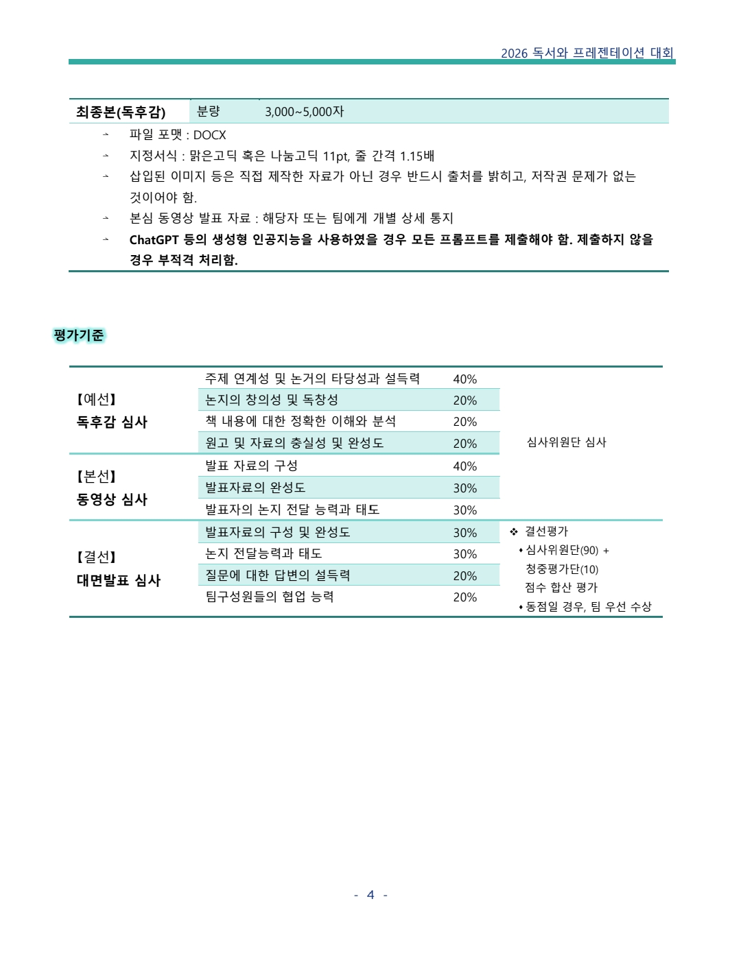 - (예선) 독후감 심사 및 결과 발표: 5. 15.(금) 개별 연락